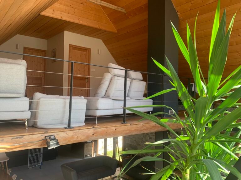 La configuration du chalet — grandes pièces à vivre, salon convivial avec cheminée centrale 4 faces, cuisine haut de gamme, mezzanine panoramique, spa privatif, salle de yoga et chambres spacieuses — en fait un lieu haut de gamme idéal pour partager des moments forts tout en préservant l’intimité de chacun.